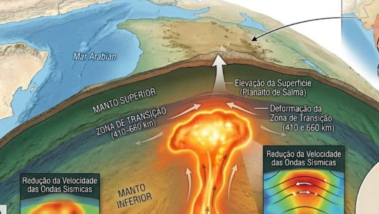 Uma estrutura geológica invisível e extremamente poderosa pode estar alterando silenciosamente o interior do nosso planeta. Pesquisadores identificaram uma espécie de “pluma fantasma” sob o leste de Omã, capaz de aquecer rochas profundas, deformar o manto terrestre e até influenciar o movimento das placas tectônicas, tudo isso sem provocar vulcões na superfície.